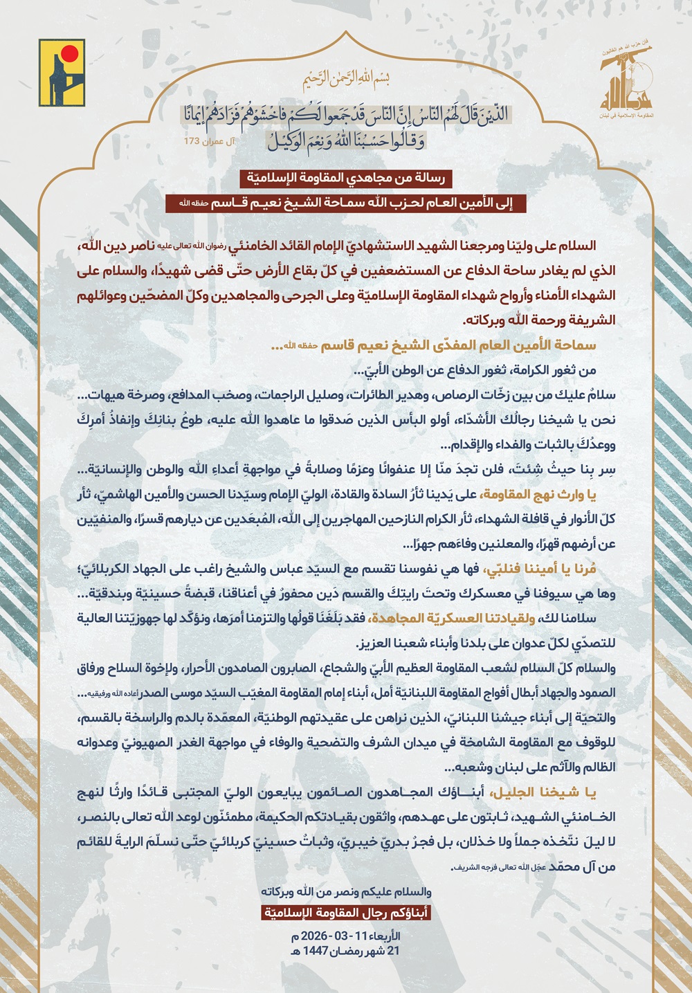 یا شيخنا الجليل، أبناؤك المجاهدون الصائمون يبايعون الولي المجتبى قائدًا وارثا لنهج الخامنئي الشهيد، ثابتون على عهدهم، واثقون بقيادتكم الحكيمة، مطمئنون لوعد الله تعالى بالنصر لا ليل نتخذه جملاً ولا خذلان، بل فجر بدري خيبري، وثبات حسيني كربلائي حتى تسلّم الراية للقائم من آل محمد عجل الله تعالى فرجه الشريف.